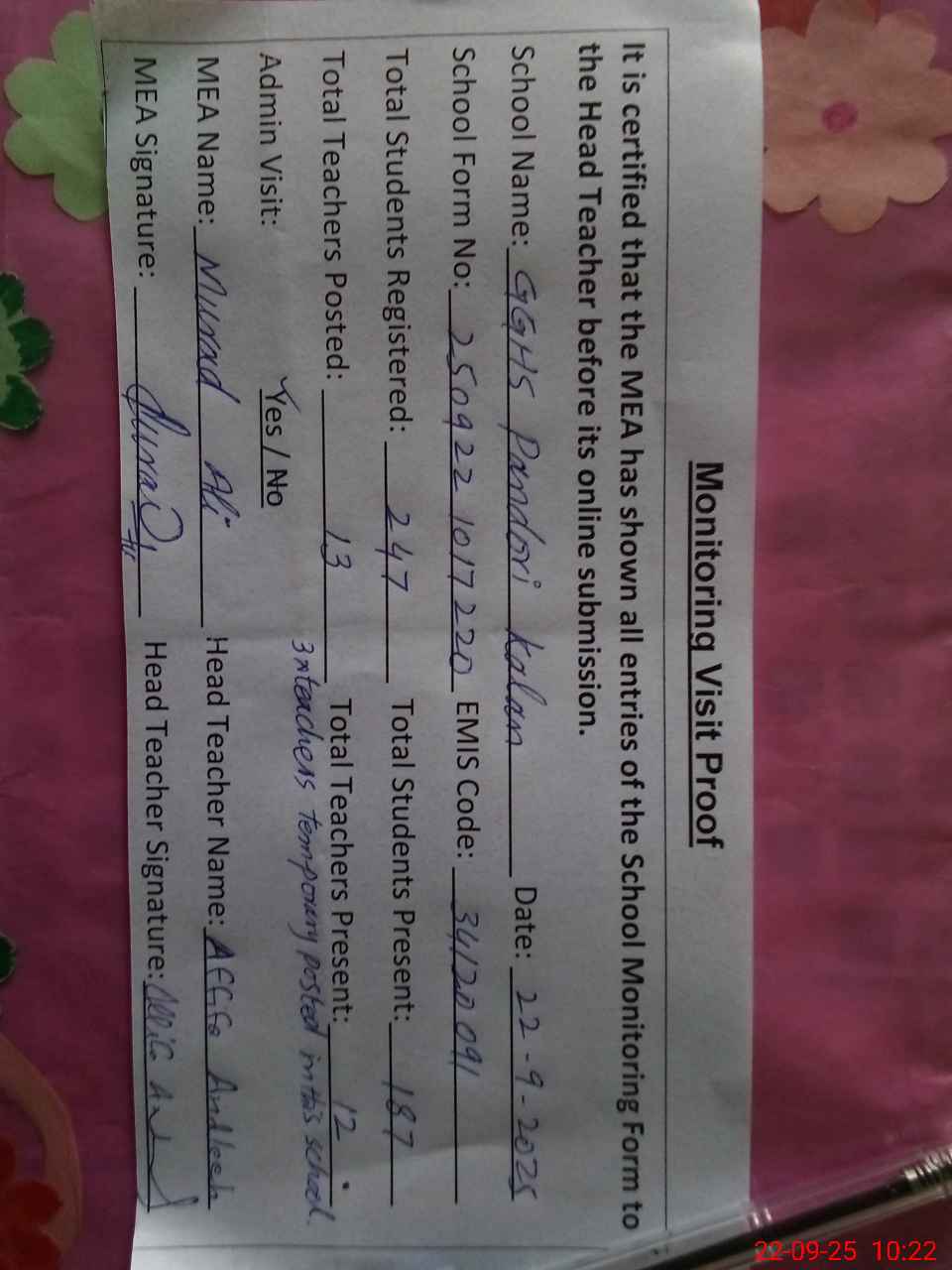 | EMIS Code: 34120091 | Name of School: GGHS PANDORI KALAN | |||