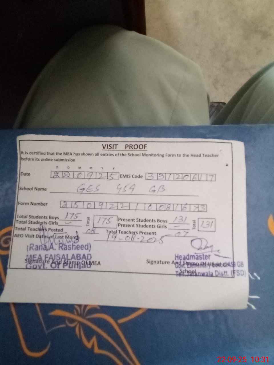 | Attendance Register | Head Teacher | MEA with School | Visit Proof |