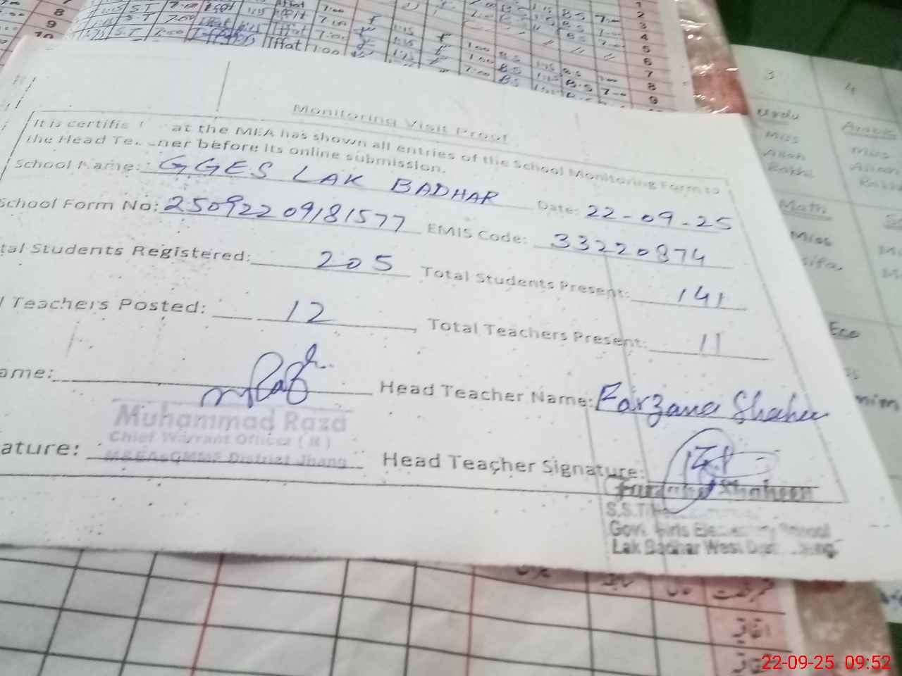 | Attendance Register | Head Teacher | MEA with School | Visit Proof |