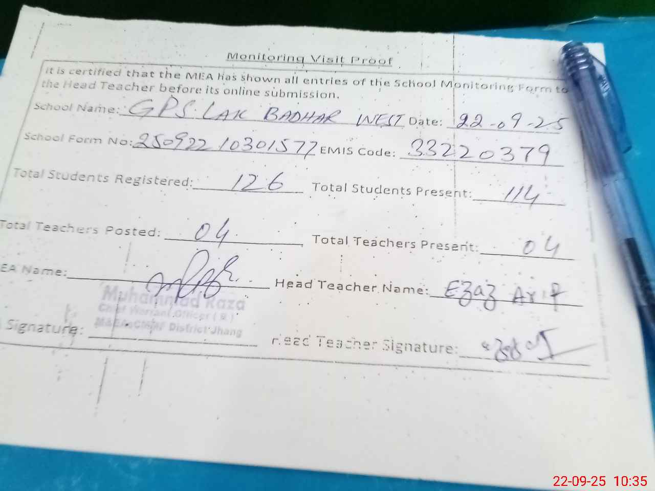 | Attendance Register | Head Teacher | MEA with School | Visit Proof |