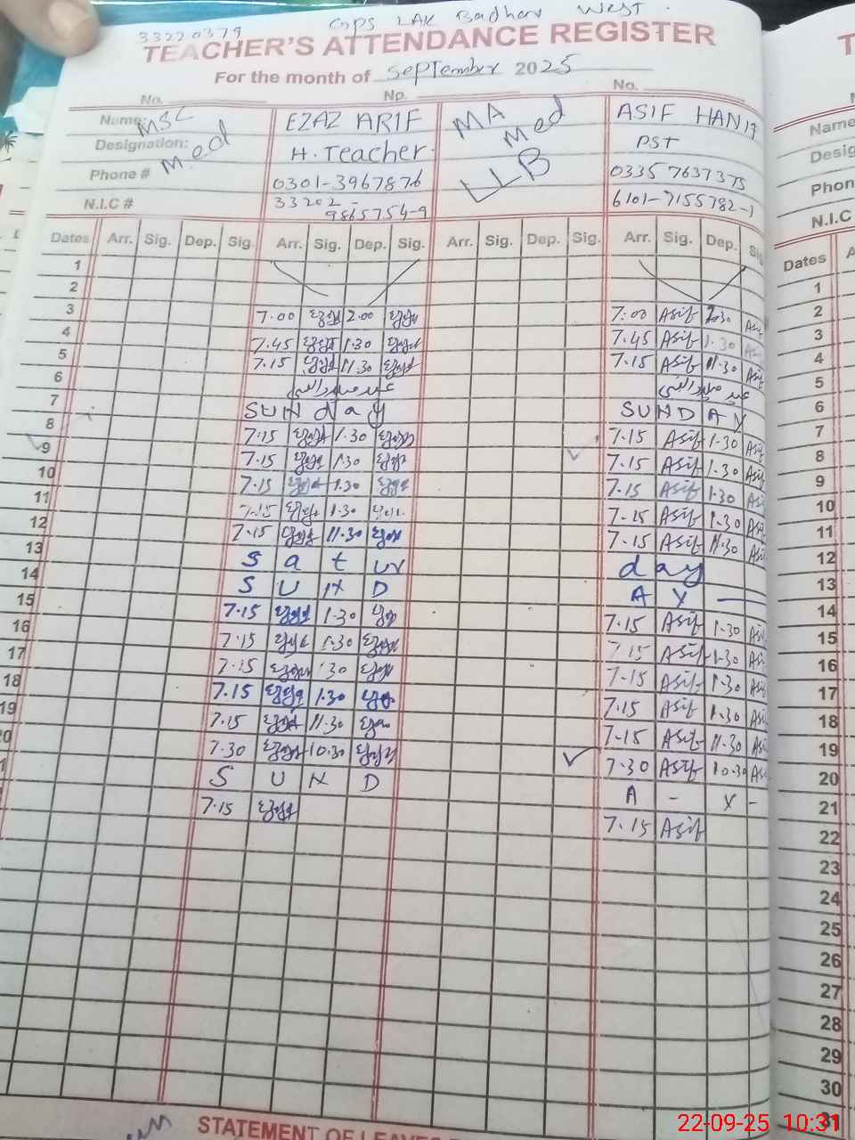 | Name: EZ**** AR**** Designation: (School Headmaster's/Headmistress's) PST Phone/Cell Number: 03**** |