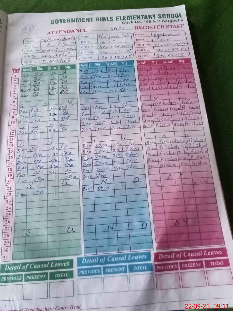 | CNIC | Full Name | Designation | R/C | Absence during last cal. month |