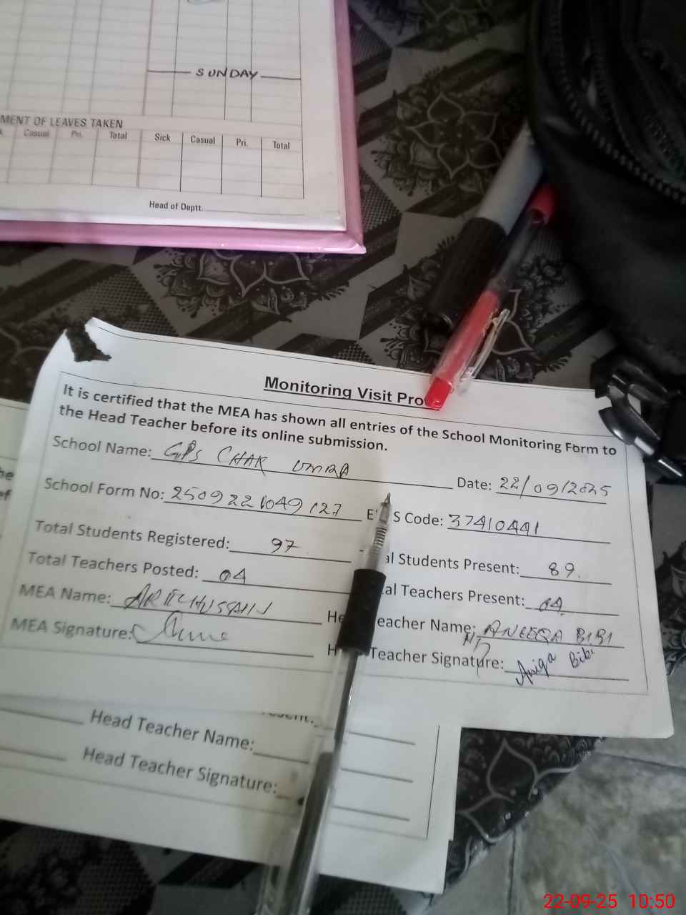 | Attendance Register | Head Teacher | MEA with School | Visit Proof |