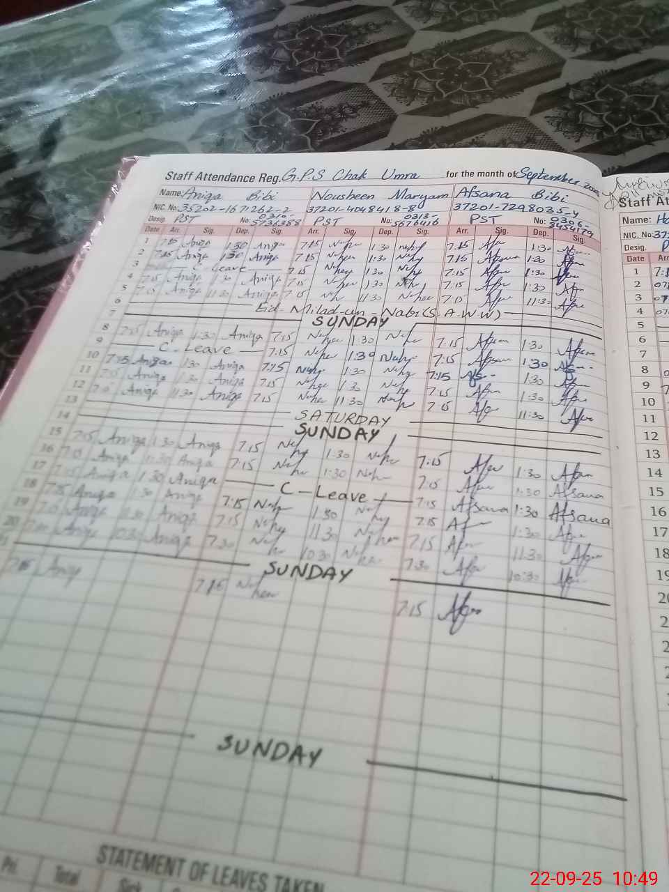 | CNIC | Full Name | Designation | R/C | Absence During Last Calender Month |