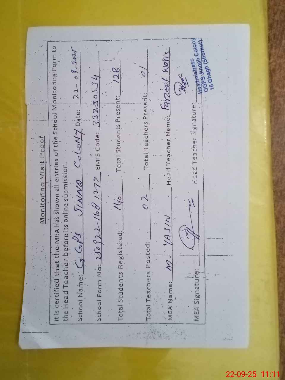 | Attendance Register | Head Teacher | MEA with School | Visit Proof |