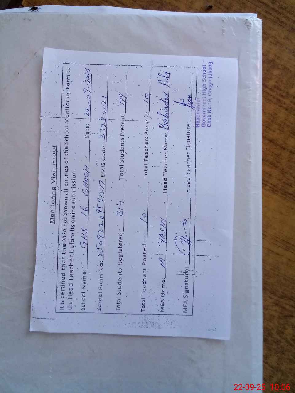 | Certified that this School was Inspected by the Undersigned MEA/DMO Today and the Information Stated Above is as Per Record. | |||||