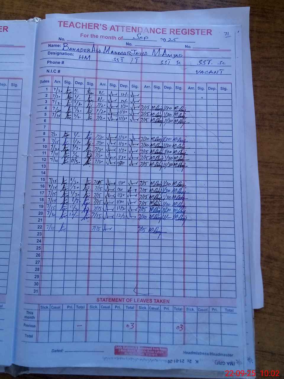 | Name: BA**** AL**** Designation: (School Headmaster's/Headmistress's) HEAD MASTER Phone/Cell Number: 03**** |