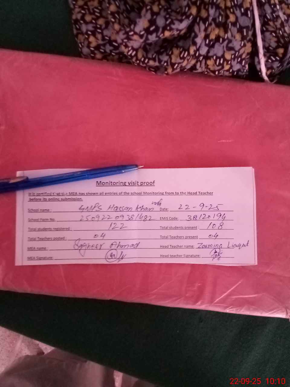 | Attendance Register | Head Teacher | MEA with School | Visit Proof |