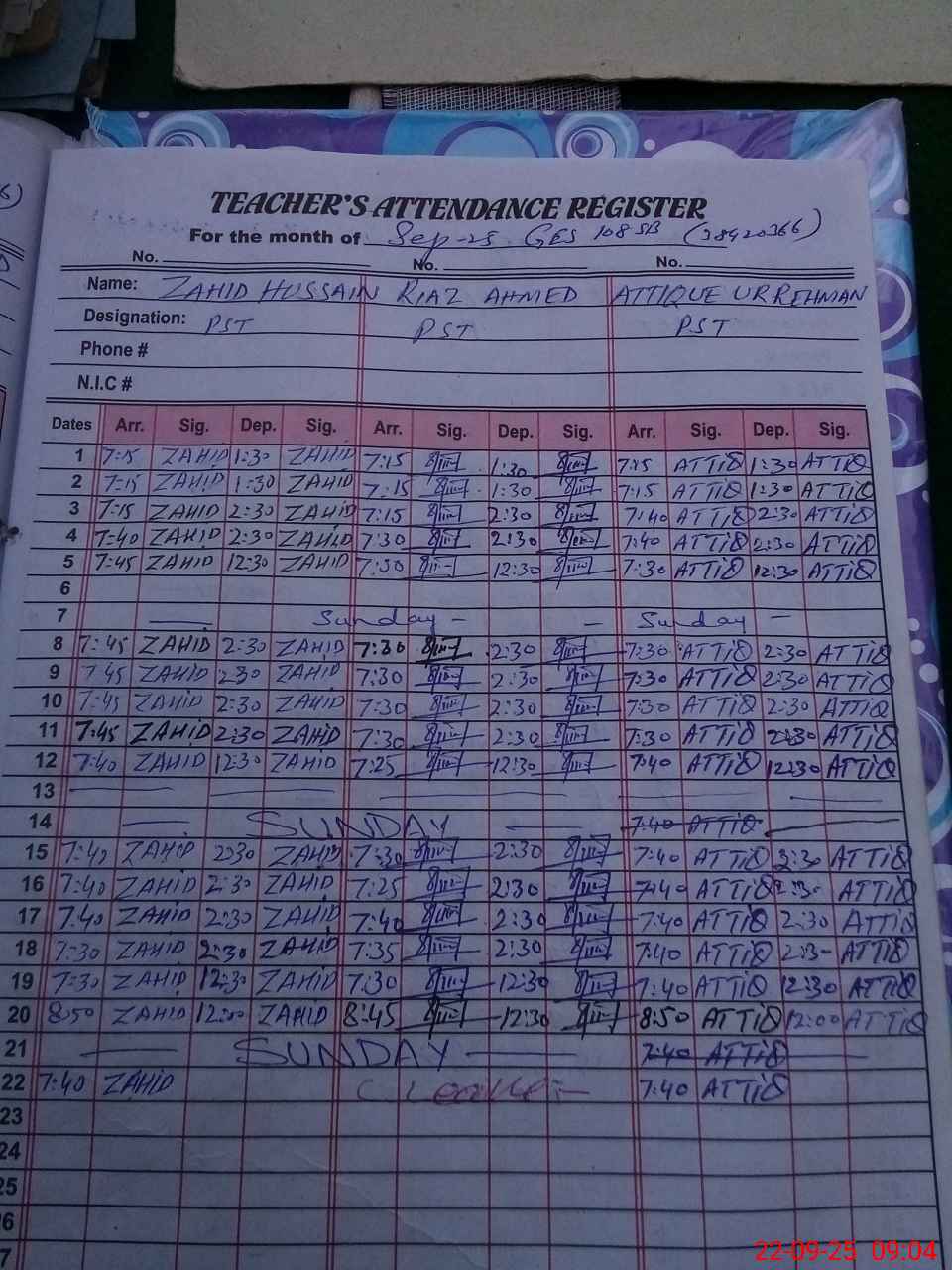 | CNIC | Full Name | Designation | R/C | Absence During Last Calender Month |