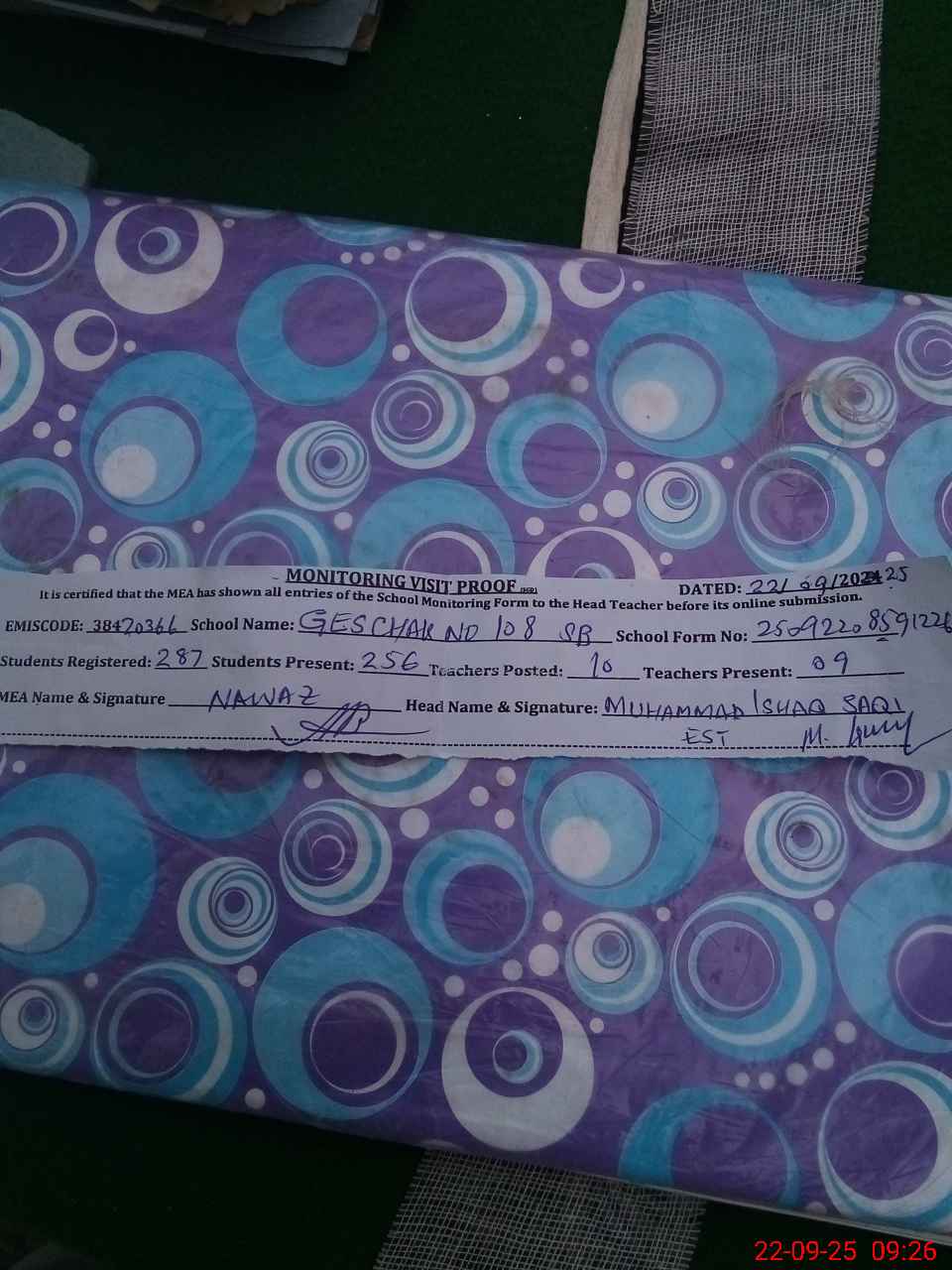 | Monitoring Date: 22-09-2025 | Start Time: 22-09-2025 08:58 AM | End Time: 22-09-2025 09:26 AM | Name of MEA: MU**** NA**** | |