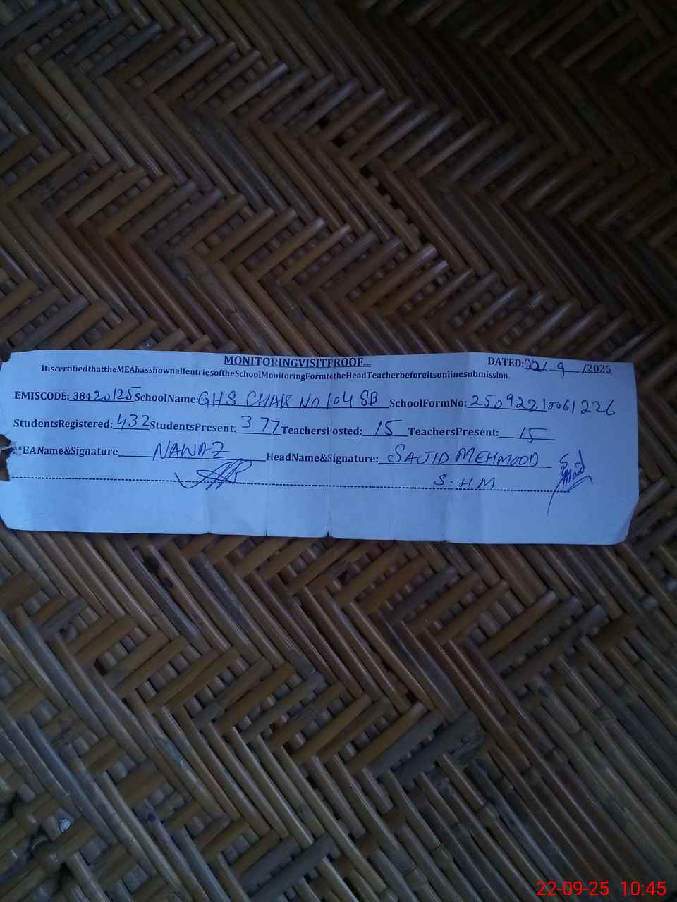 | EMIS Code: 38420125 | Name of School: GHS CHAK NO.104 SB | |||
