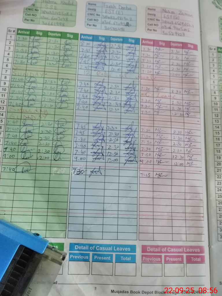 | CNIC | Full Name | Designation | R/C | Absence during last cal. month |