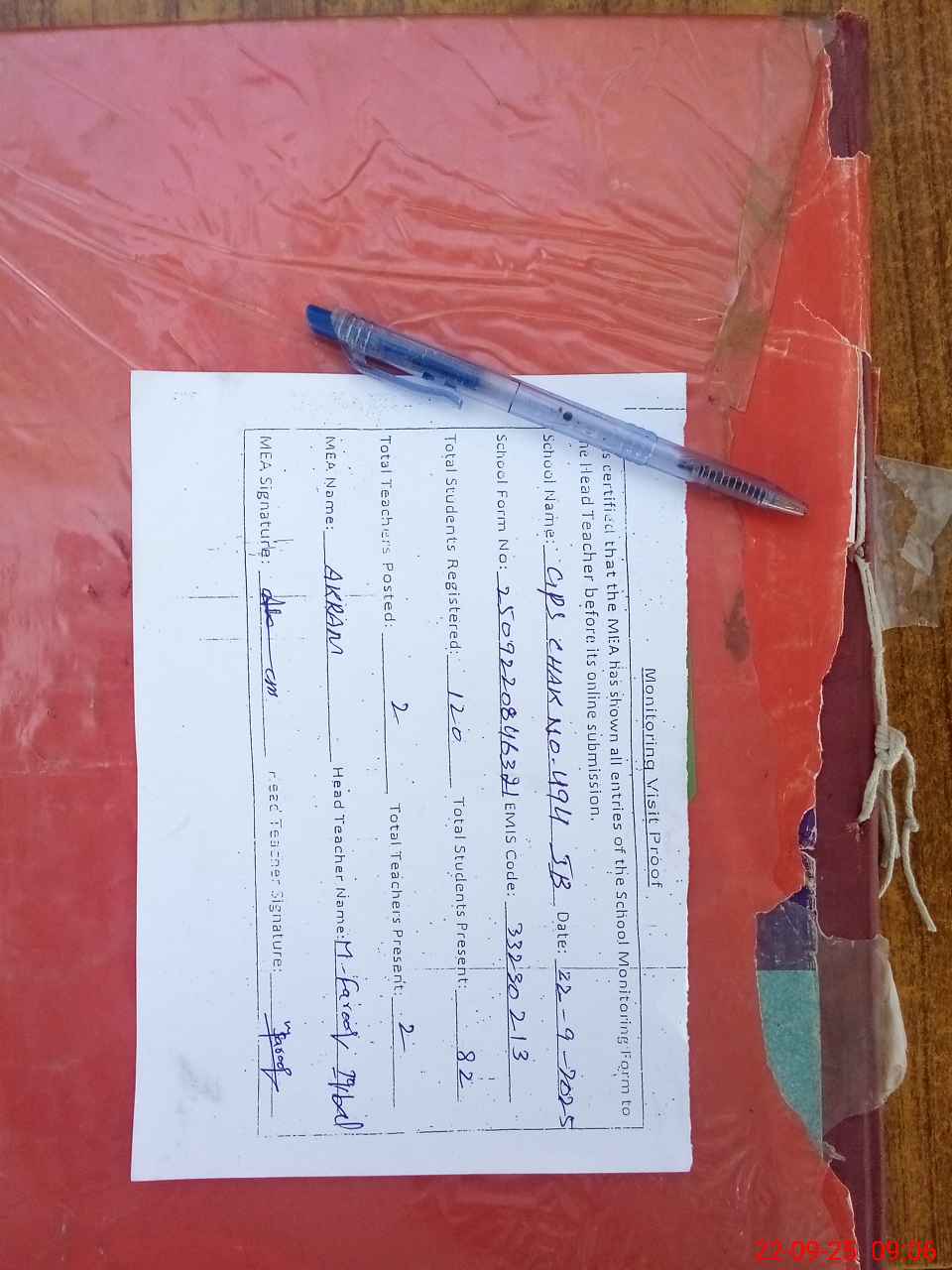 | Attendance Register | Head Teacher | MEA with School | Visit Proof |