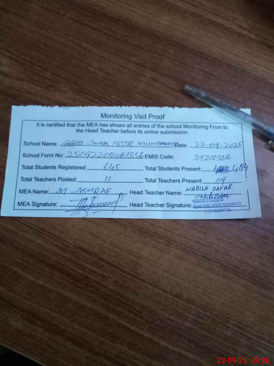 | Attendance Register | Head Teacher | MEA with School | Visit Proof |