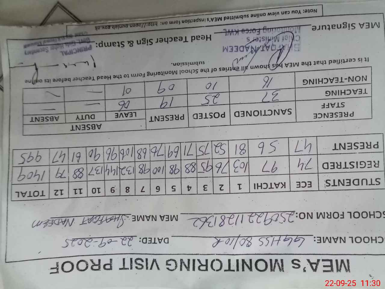 | Attendance Register | Head Teacher | MEA with School | Visit Proof |