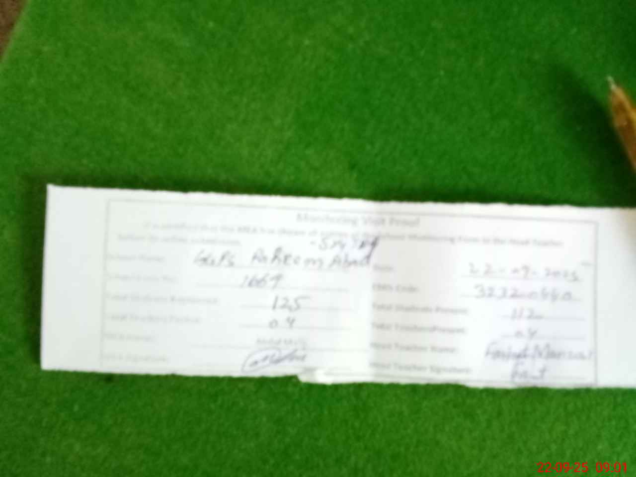 | Monitoring Date: 22-09-2025 | Start Time: 22-09-2025 08:27 AM | End Time: 22-09-2025 09:01 AM | Name of MEA: AB**** MA**** | |