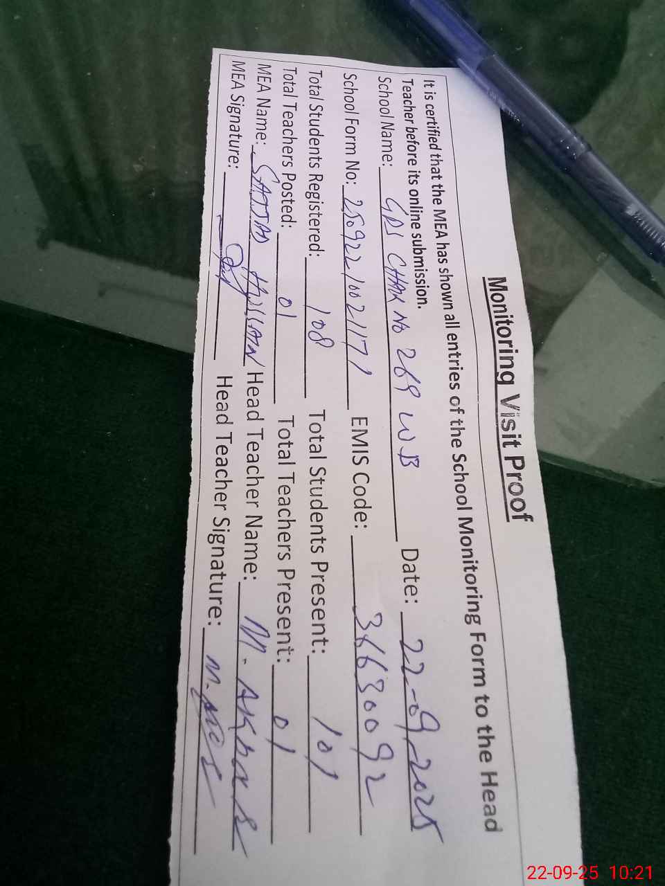 | Attendance Register | Head Teacher | MEA with School | Visit Proof |