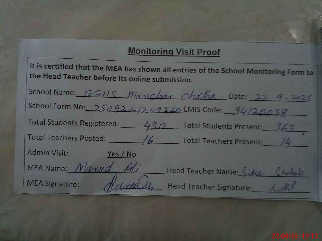 | EMIS Code: 34120038 | Name of School: GGHS MANCHAR CHATHA | |||