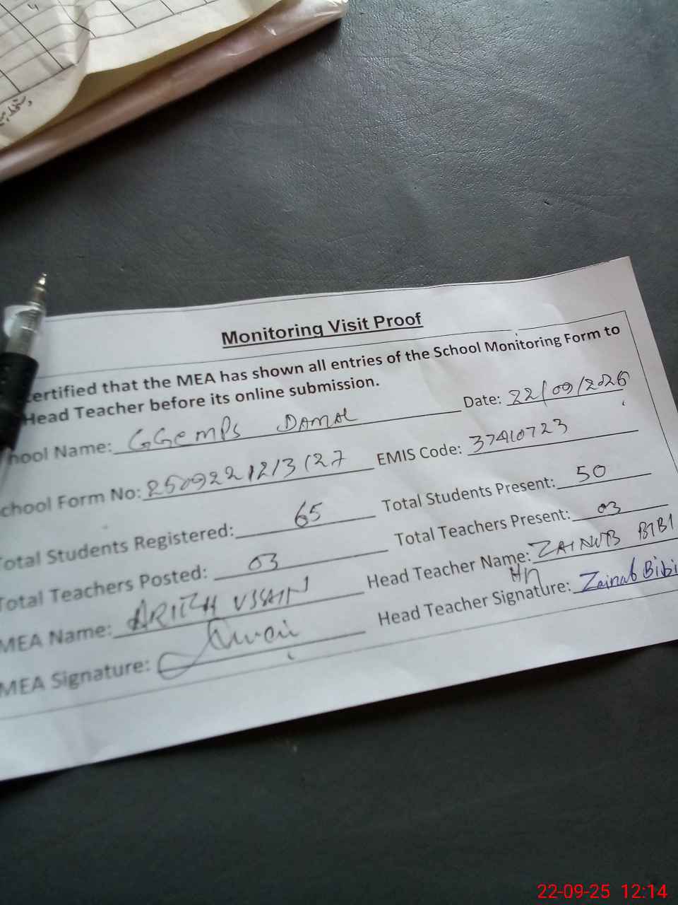 | Attendance Register | Head Teacher | MEA with School | Visit Proof |