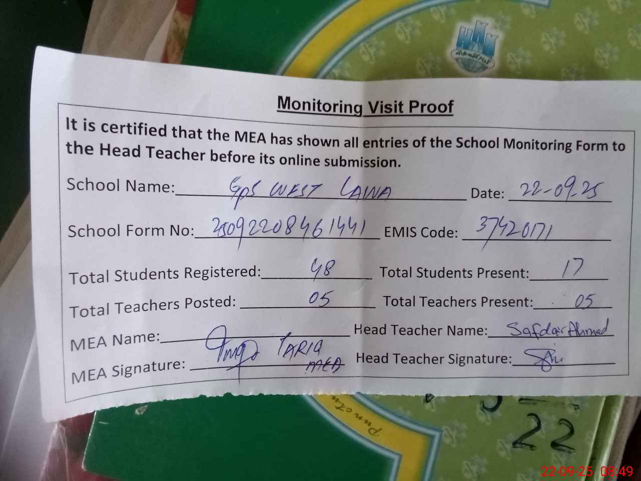 | Attendance Register | Head Teacher | MEA with School | Visit Proof |