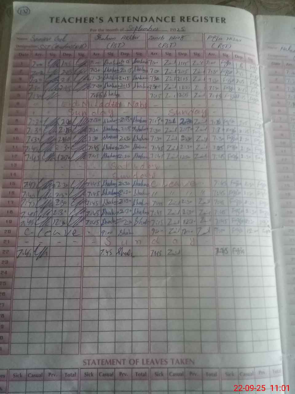 | CNIC | Full Name | Designation | R/C | Absence During Last Calender Month |