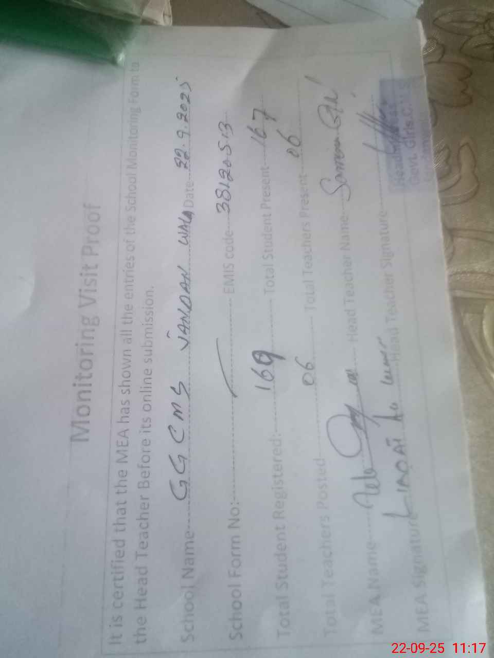 | Attendance Register | Head Teacher | MEA with School | Visit Proof |
