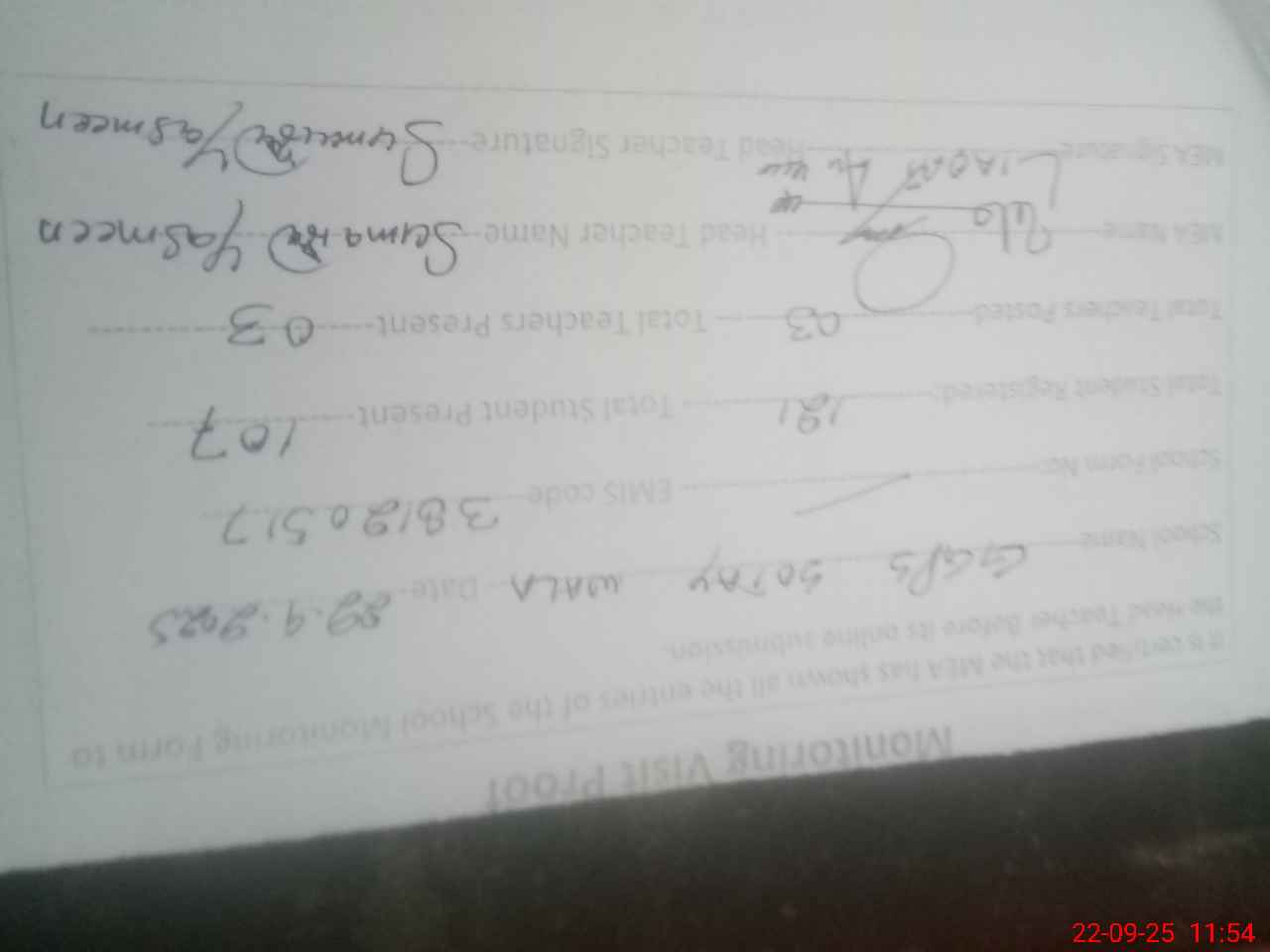 | Attendance Register | Head Teacher | MEA with School | Visit Proof |