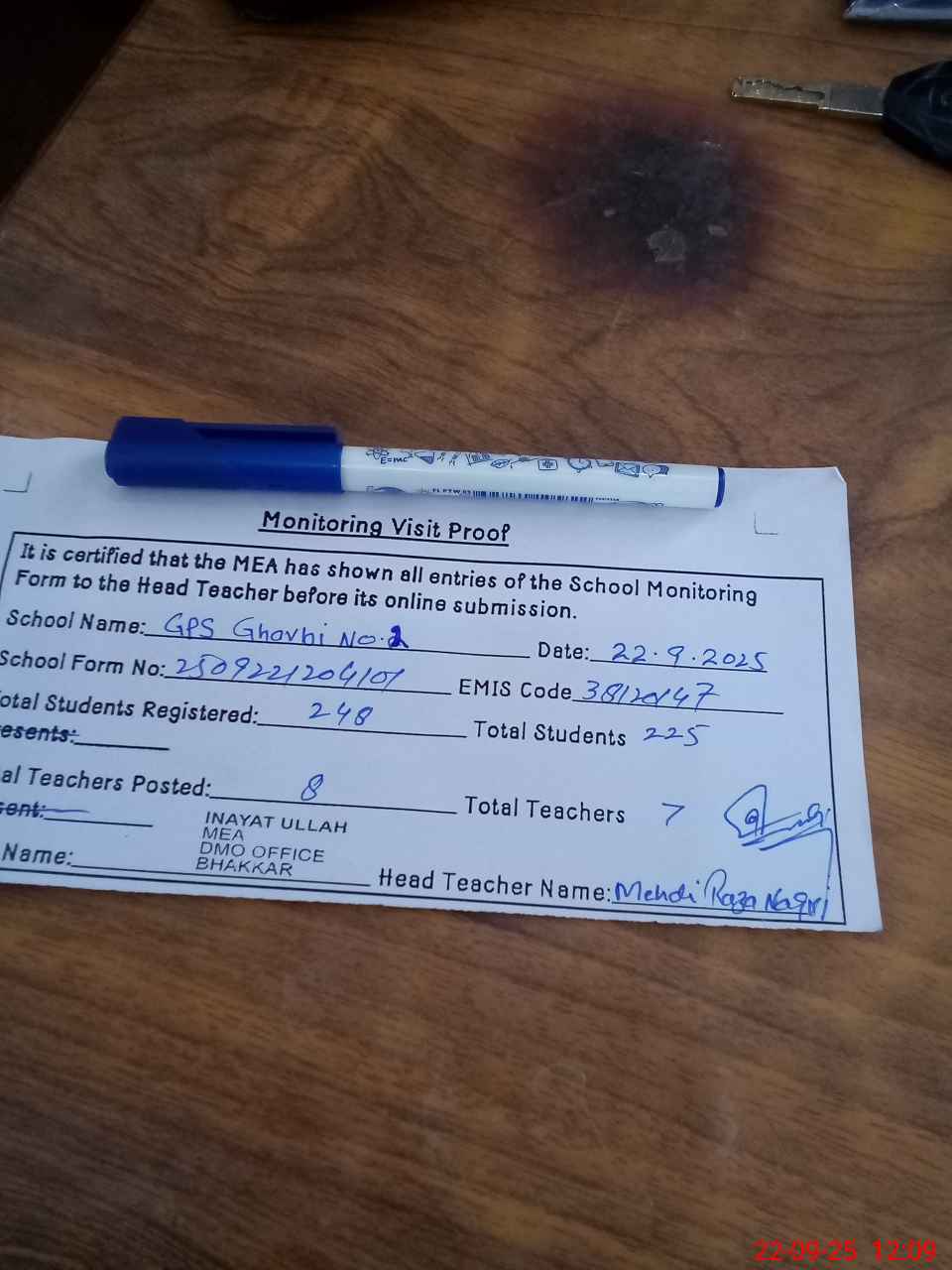 | Attendance Register | Head Teacher | MEA with School | Visit Proof |