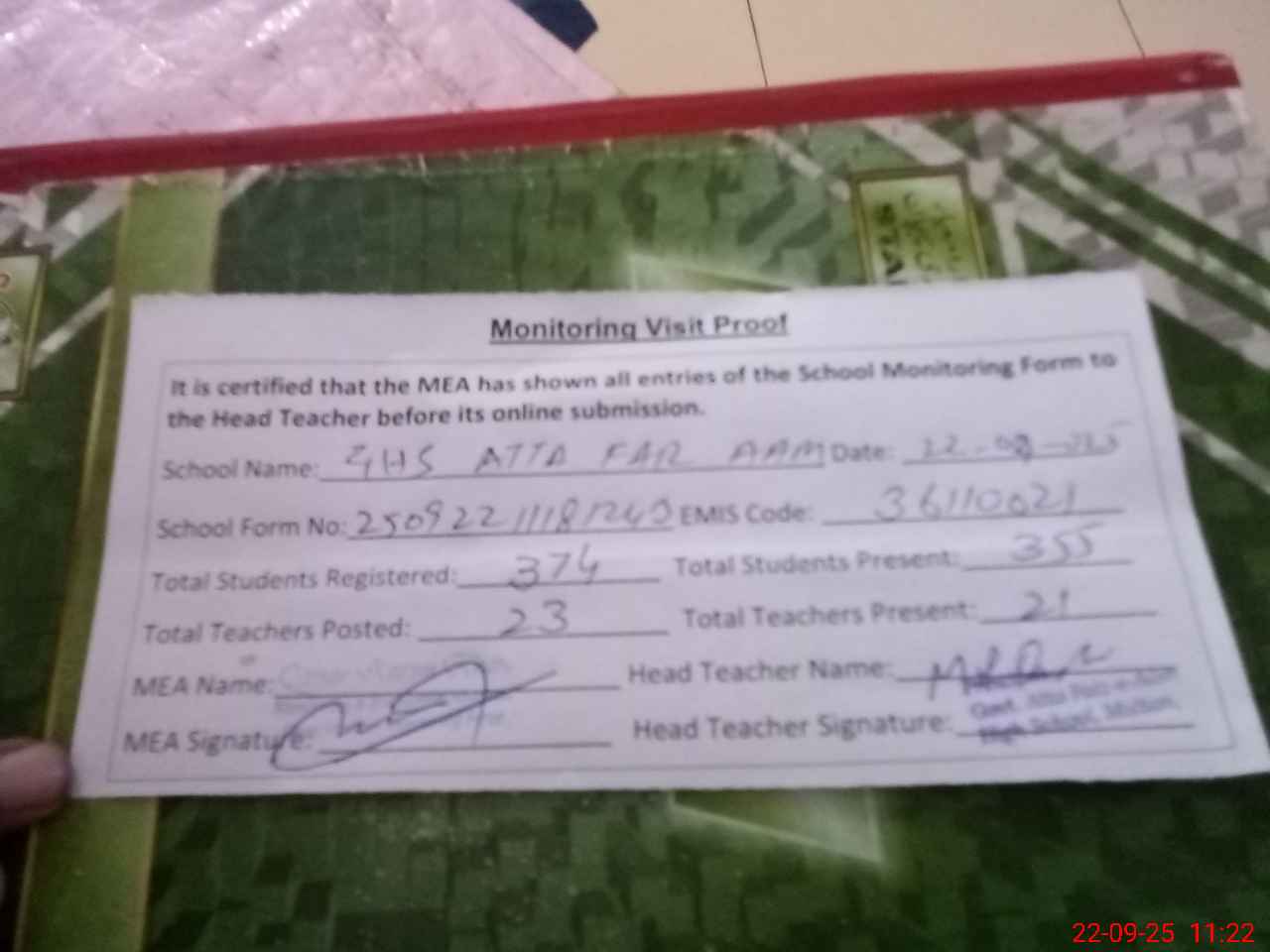| Attendance Register | Head Teacher | MEA with School | Visit Proof |