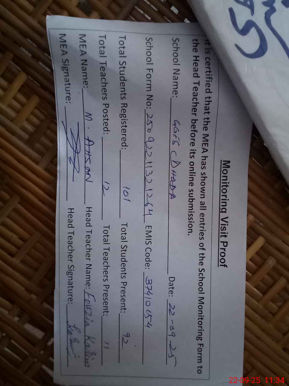 | Attendance Register | Head Teacher | MEA with School | Visit Proof |