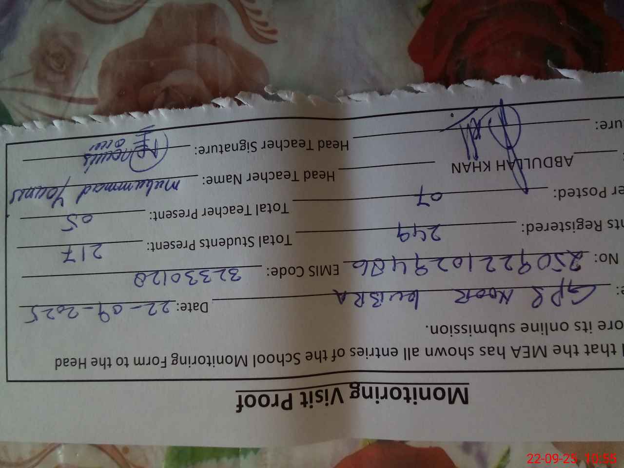 | Certified that this School was Inspected by the Undersigned MEA/DMO Today and the Information Stated Above is as Per Record. | |||||
