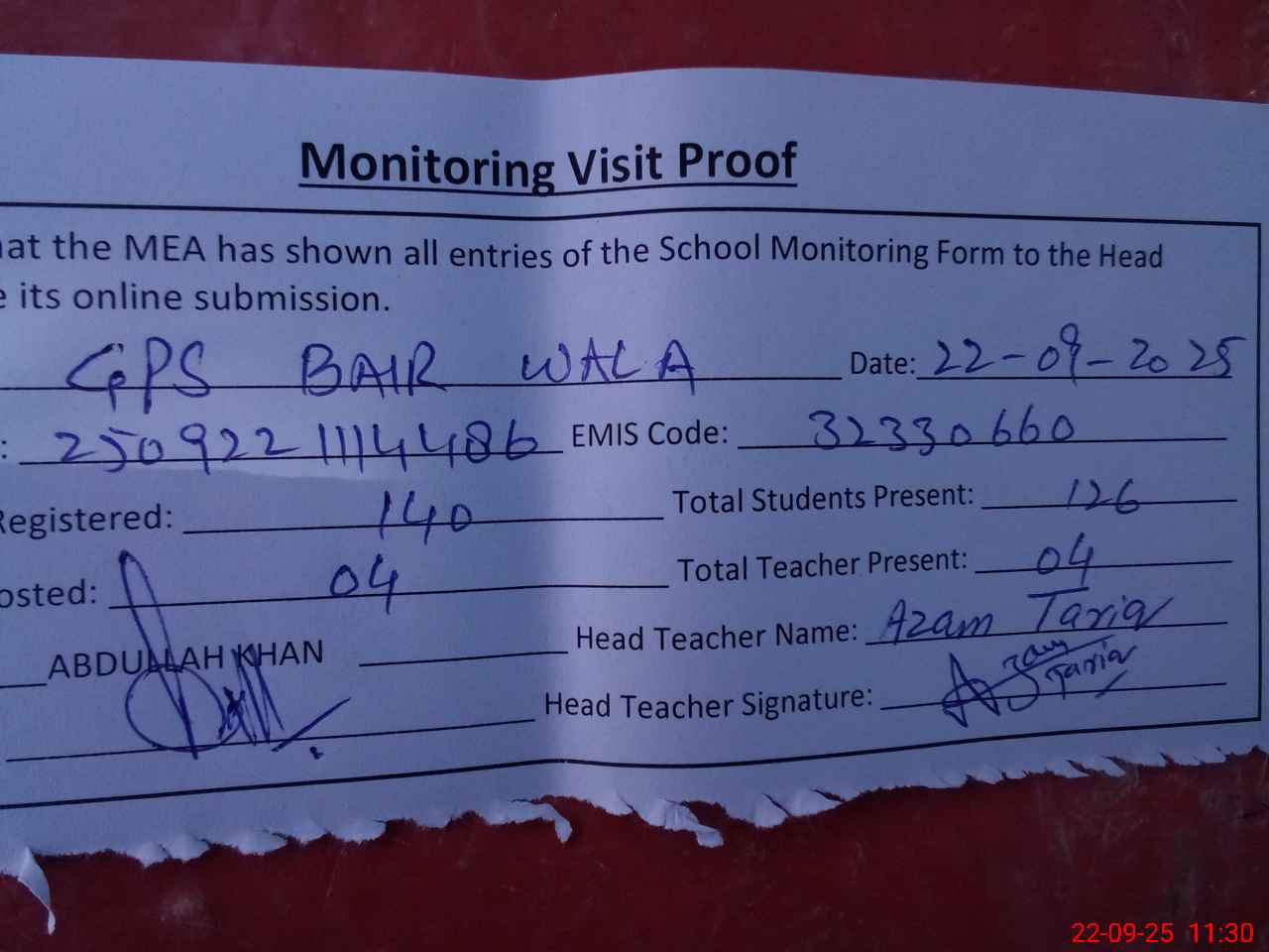 | Attendance Register | Head Teacher | MEA with School | Visit Proof |