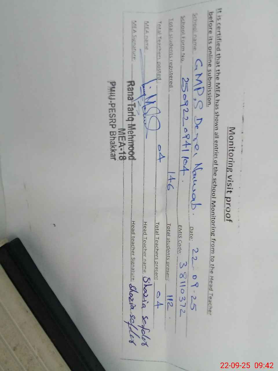 | Attendance Register | Head Teacher | MEA with School | Visit Proof |