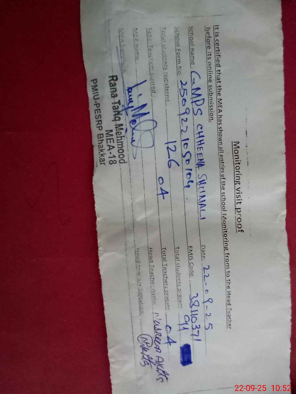 | Certified that this School was Inspected by the Undersigned MEA/DMO Today and the Information Stated Above is as Per Record. | |||||