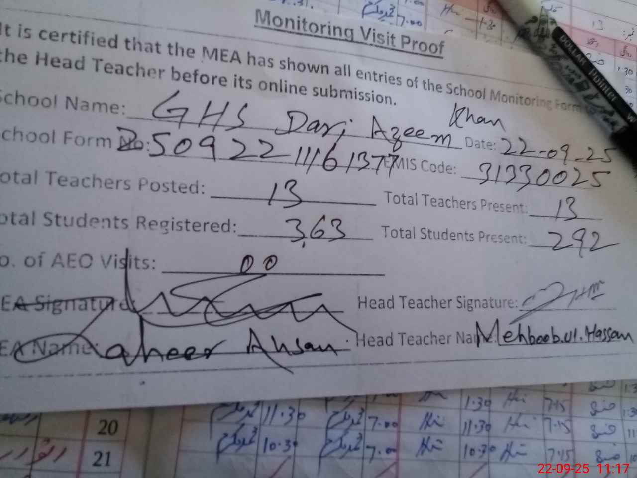 | EMIS Code: 31330025 | Name of School: GHS DARI AZEEM KHAN | |||