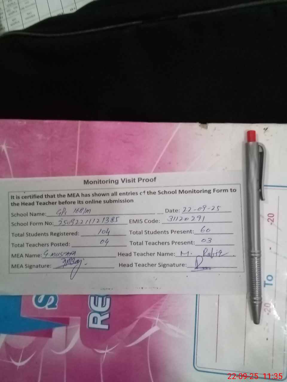 | Attendance Register | Head Teacher | MEA with School | Visit Proof |