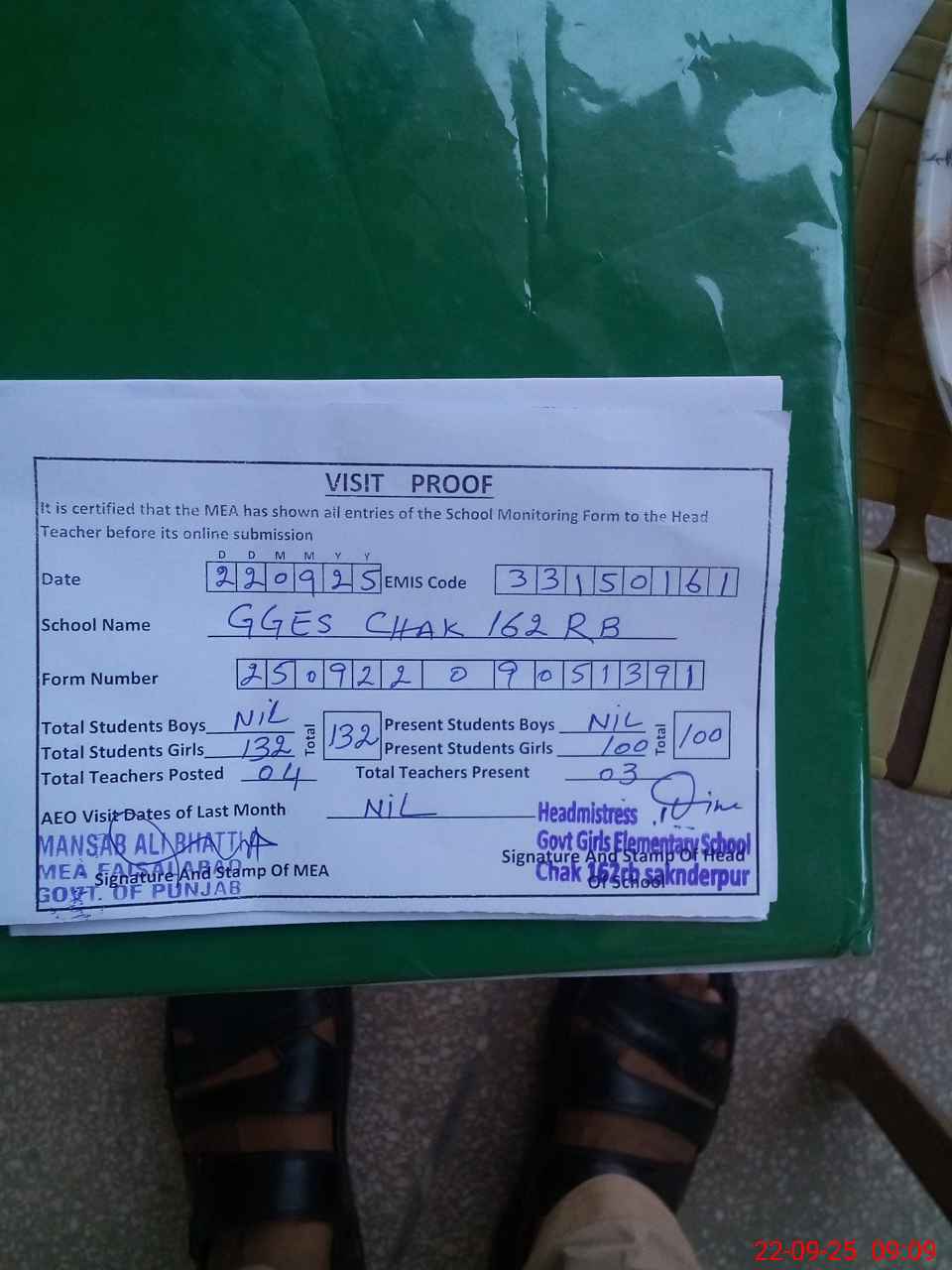 | Attendance Register | Head Teacher | MEA with School | Visit Proof |
