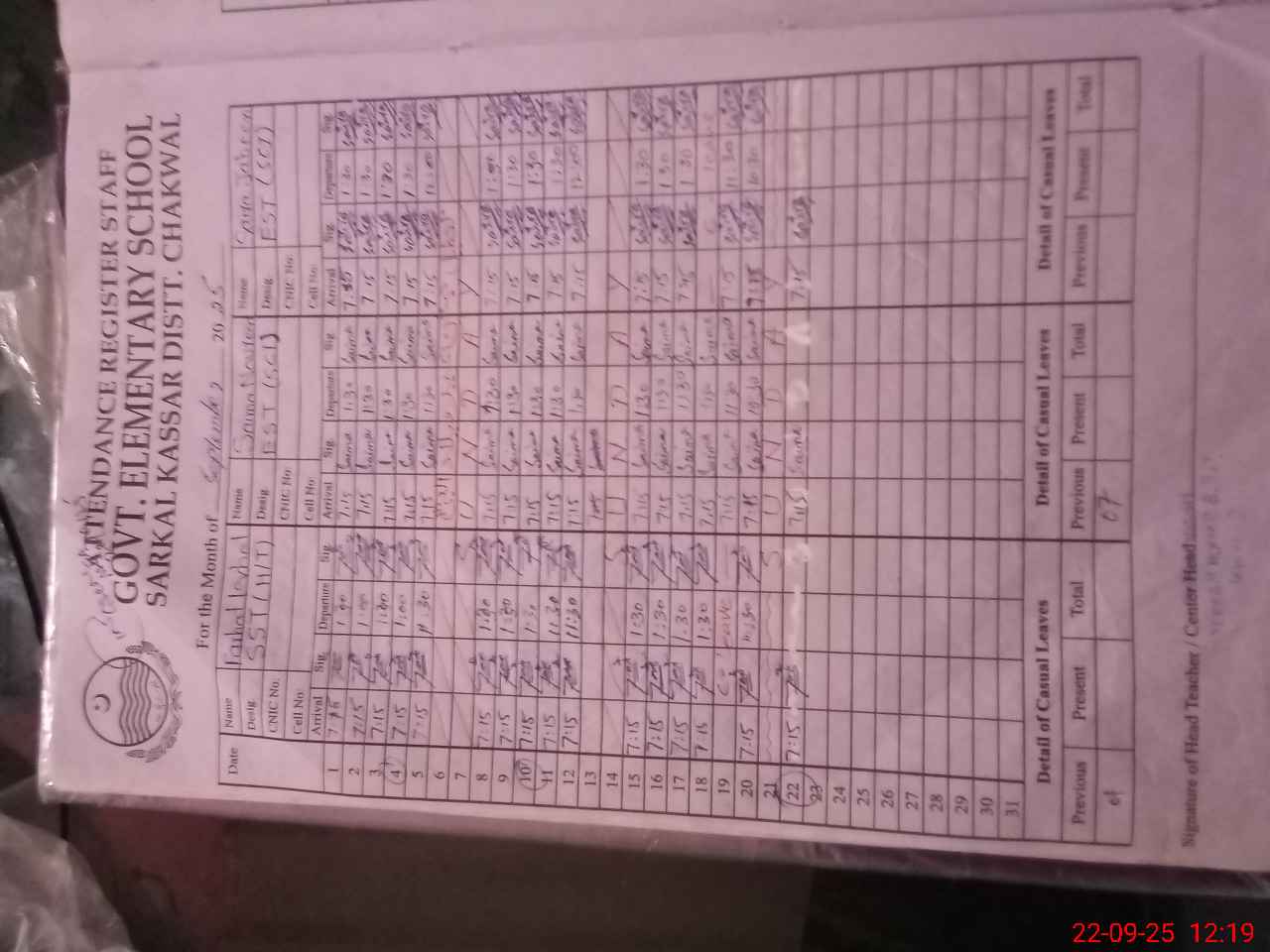 | CNIC | Full Name | Designation | R/C | Absence during last cal. month |