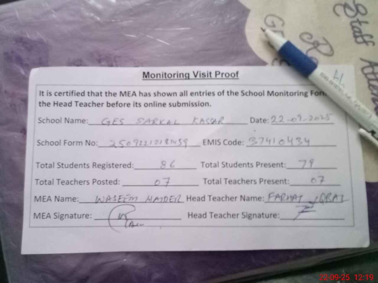 | Attendance Register | Head Teacher | MEA with School | Visit Proof |