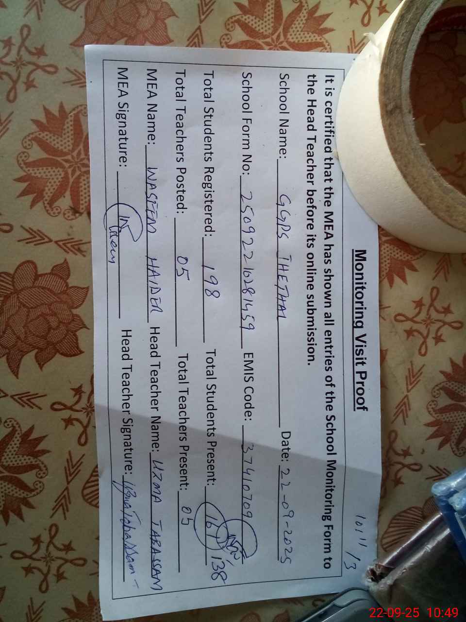 | Name: UZ**** TA**** Designation: (School Headmaster's/Headmistress's) HEADMISTRESS Phone/Cell Number: 03**** |