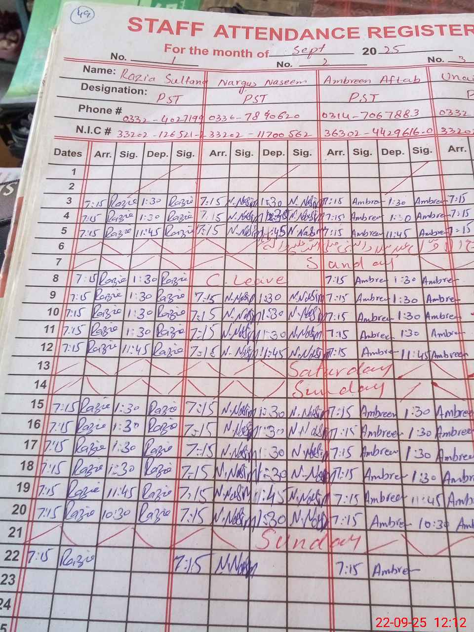 | Remarks (Use Separate Page if Required): Teacher Unaiza Maqbool Absent from school since 8 September 2025 without intimation to school head | |||||