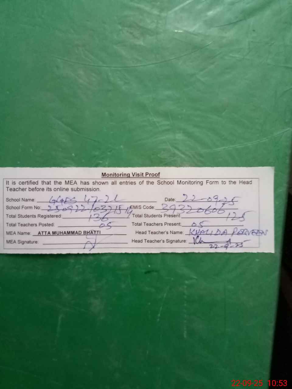 | Attendance Register | Head Teacher | MEA with School | Visit Proof |