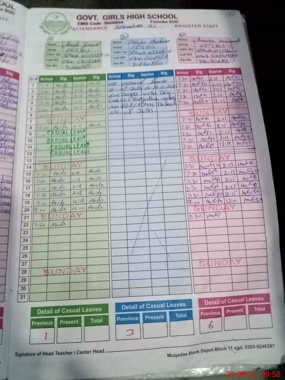 | CNIC | Full Name | Designation | R/C | Absence During Last Calender Month |