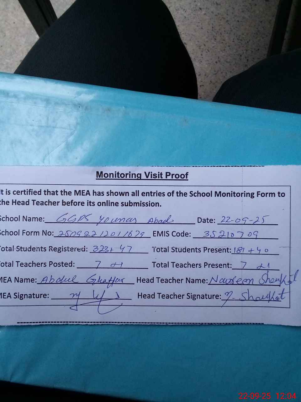 | EMIS Code: 35210709 | Name of School: GGPS YOUNAS ABAD | |||