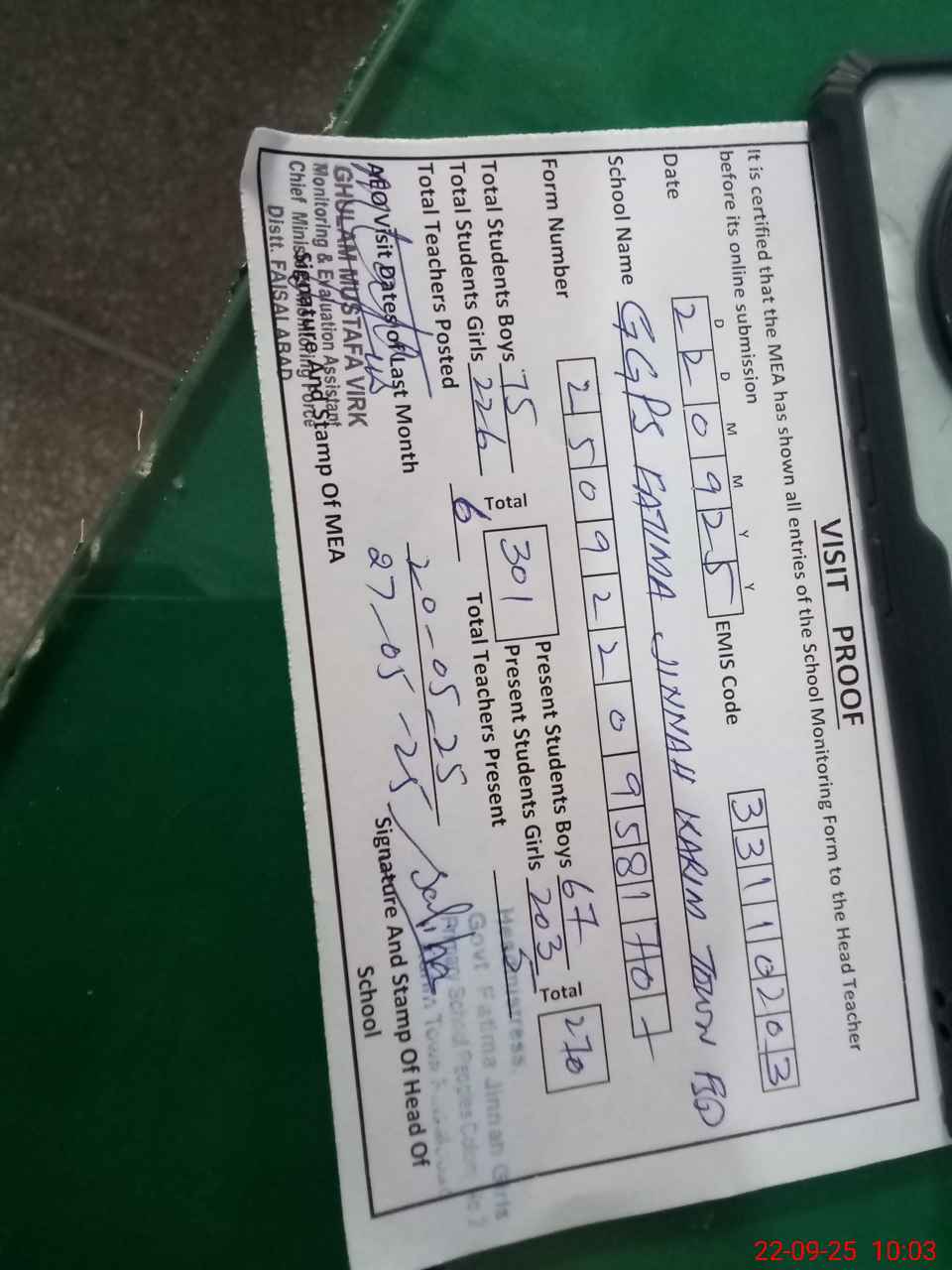 | EMIS Code: 33110203 | Name of School: GGPS FATIMA JINNAH KARIM TOWN FSD | |||