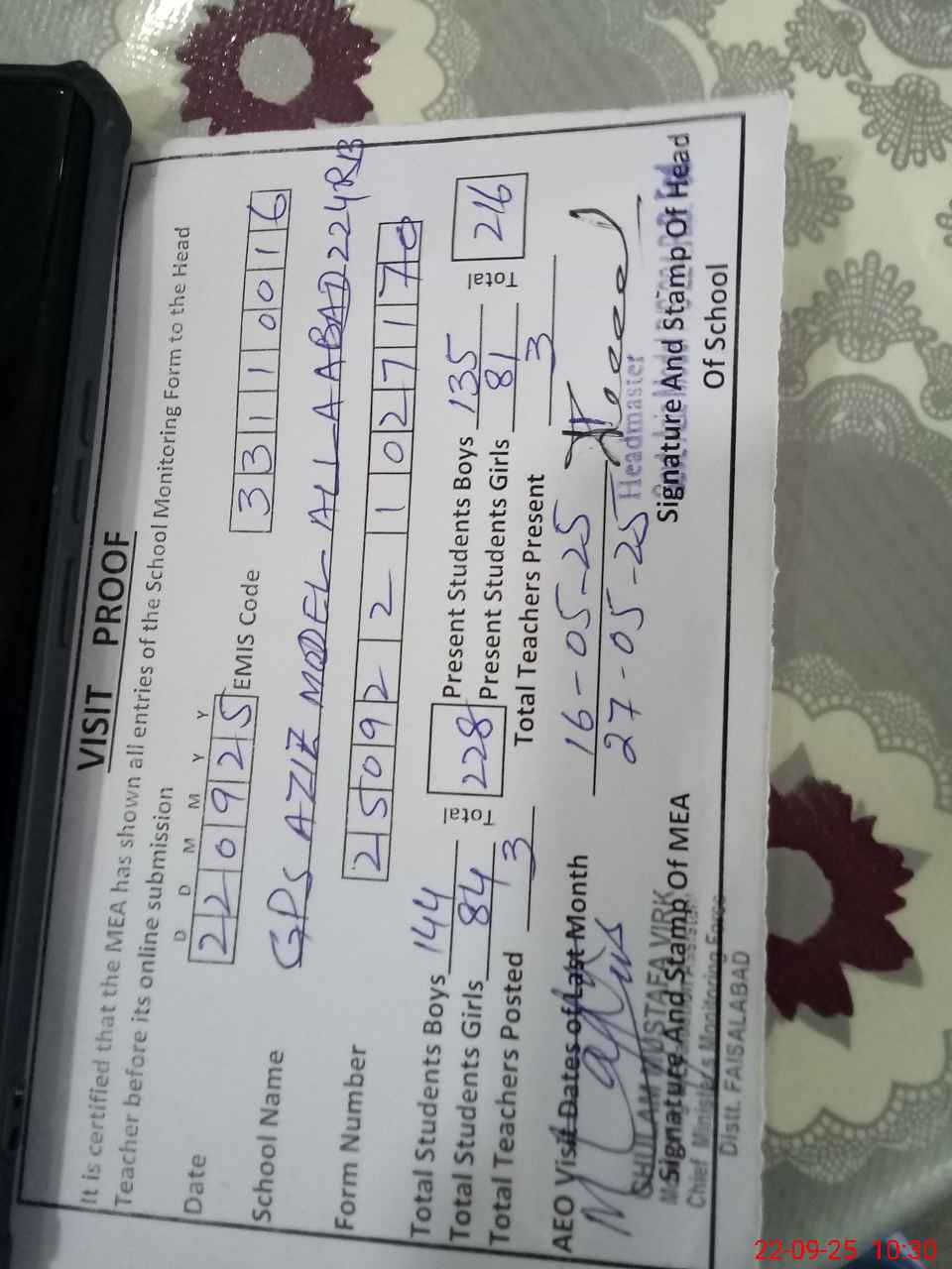 | Attendance Register | Head Teacher | MEA with School | Visit Proof |
