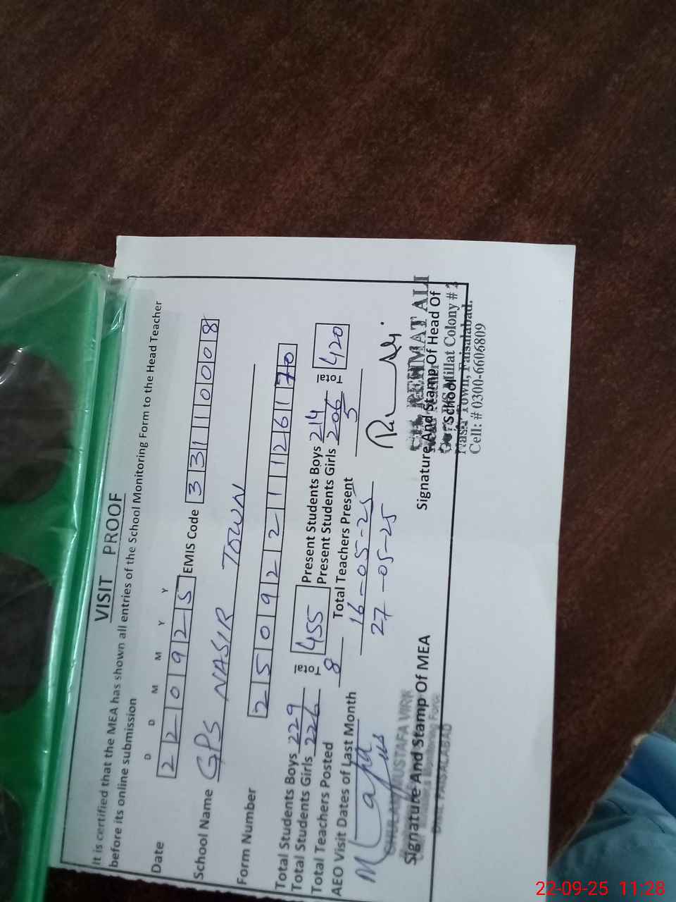 | Attendance Register | Head Teacher | MEA with School | Visit Proof |