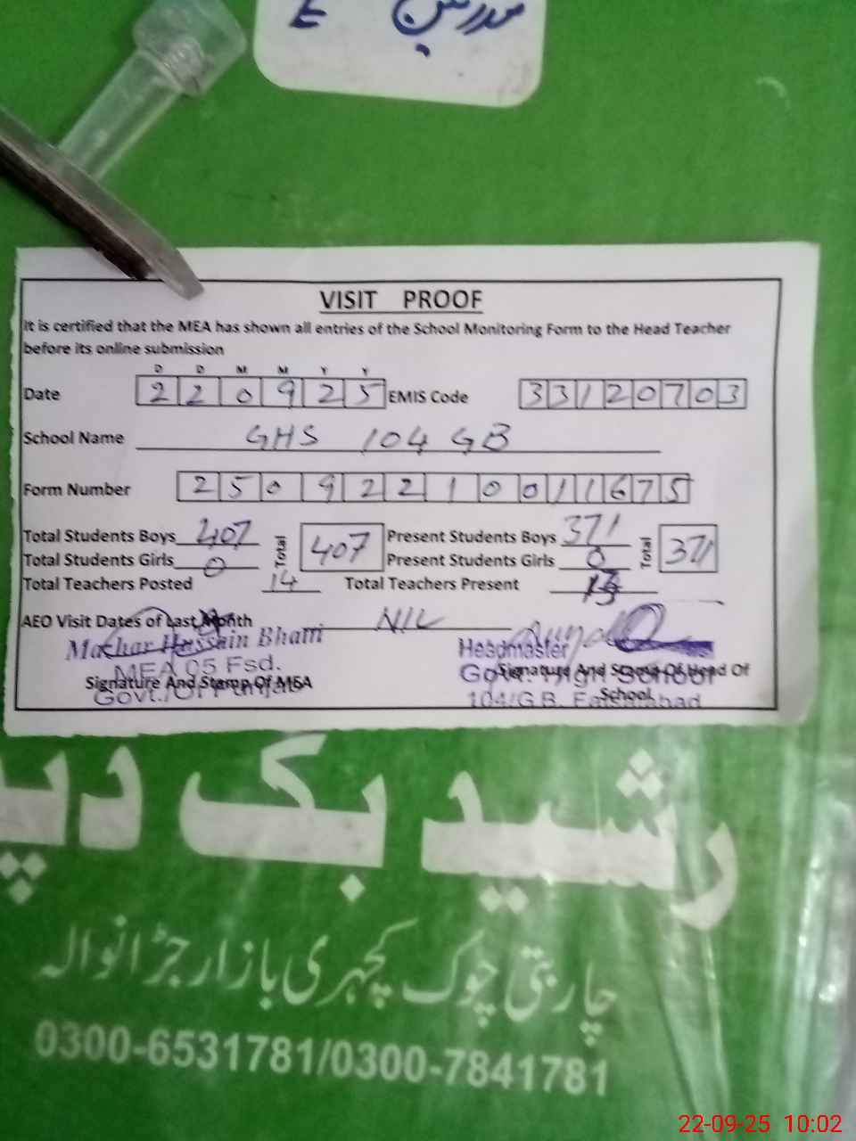 | EMIS Code: 33120703 | Name of School: GHS 104 GB | |||