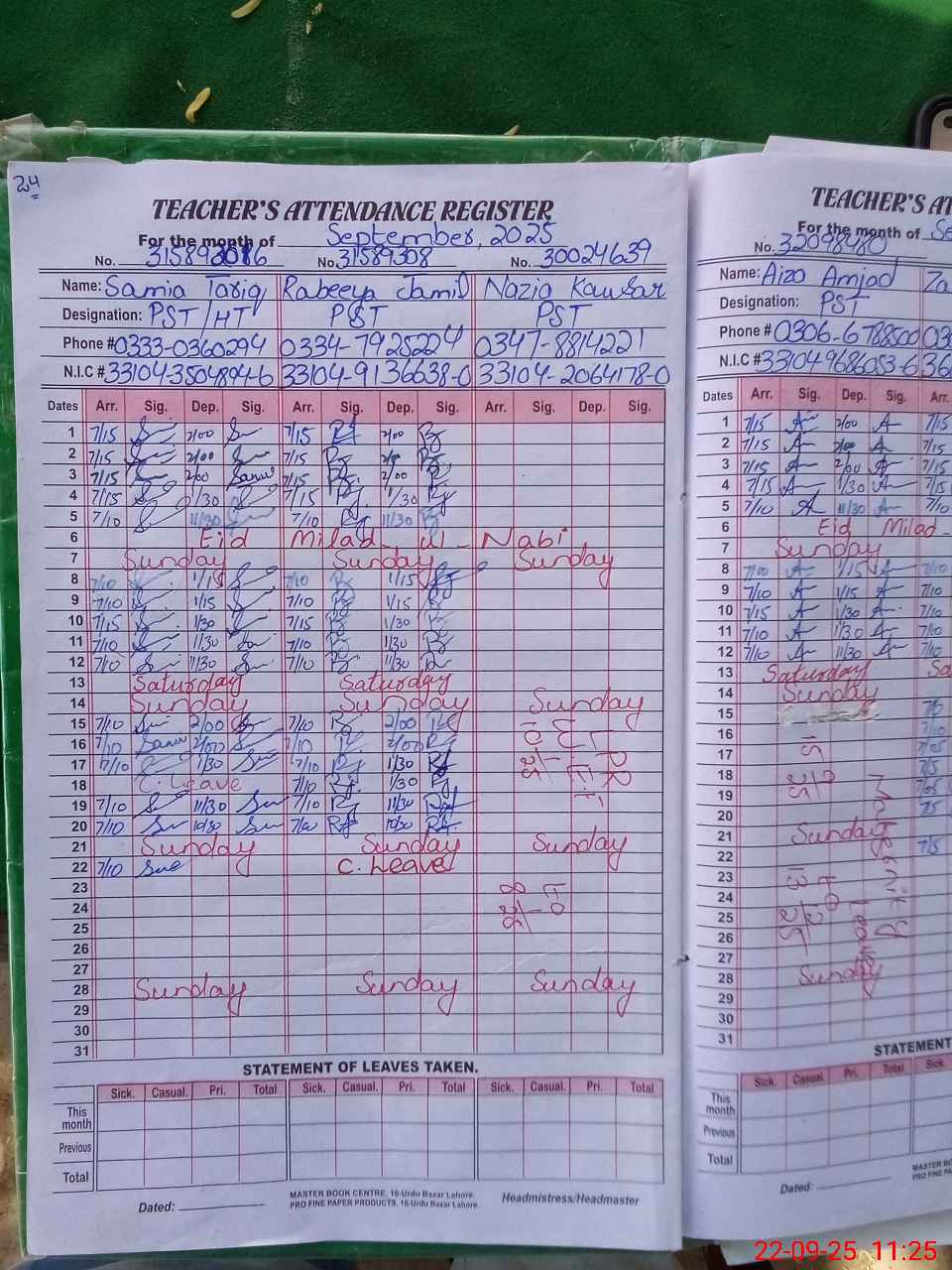 | CNIC | Full Name | Designation | R/C | Absence During Last Calender Month |