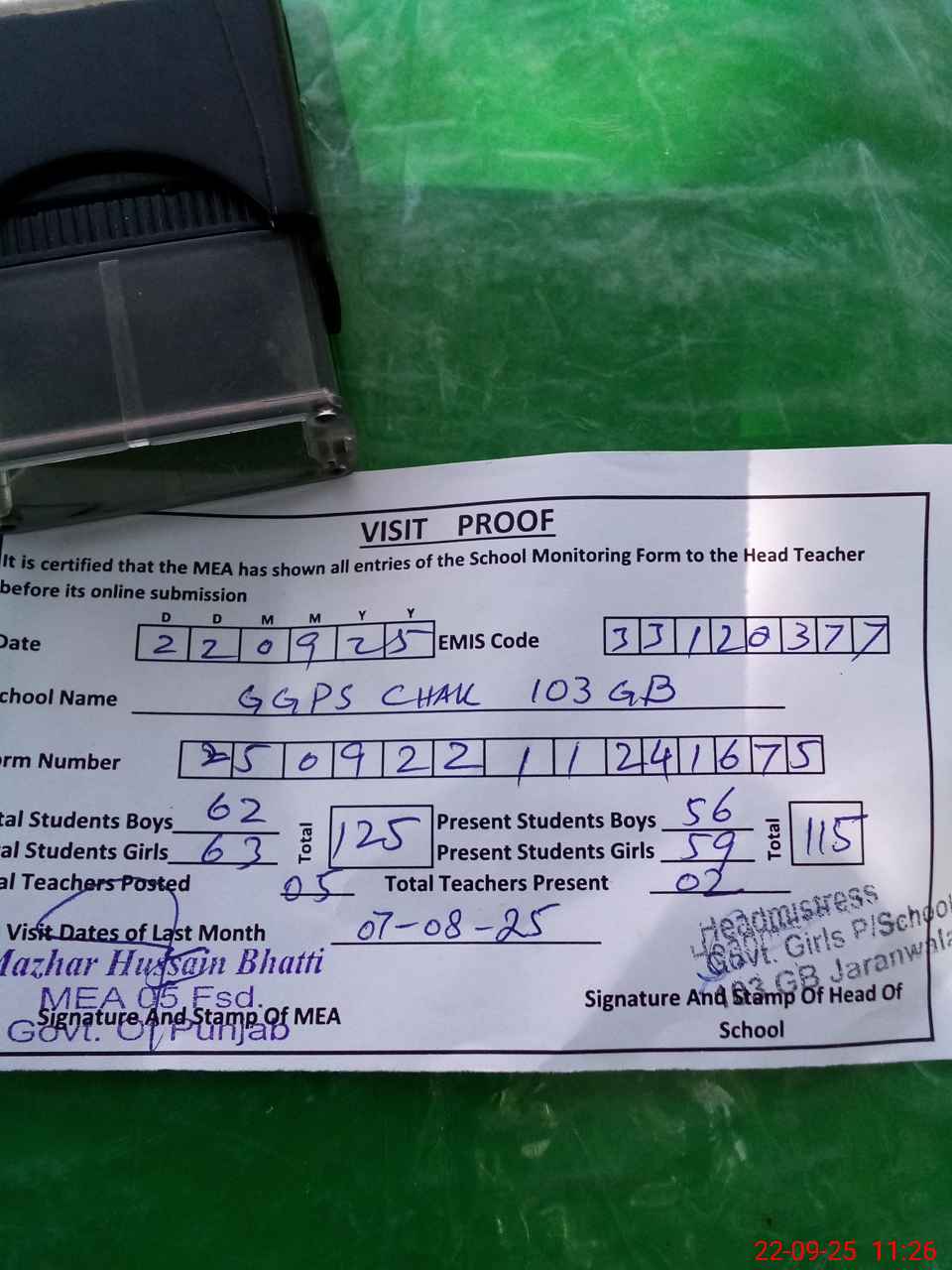 | Attendance Register | Head Teacher | MEA with School | Visit Proof |